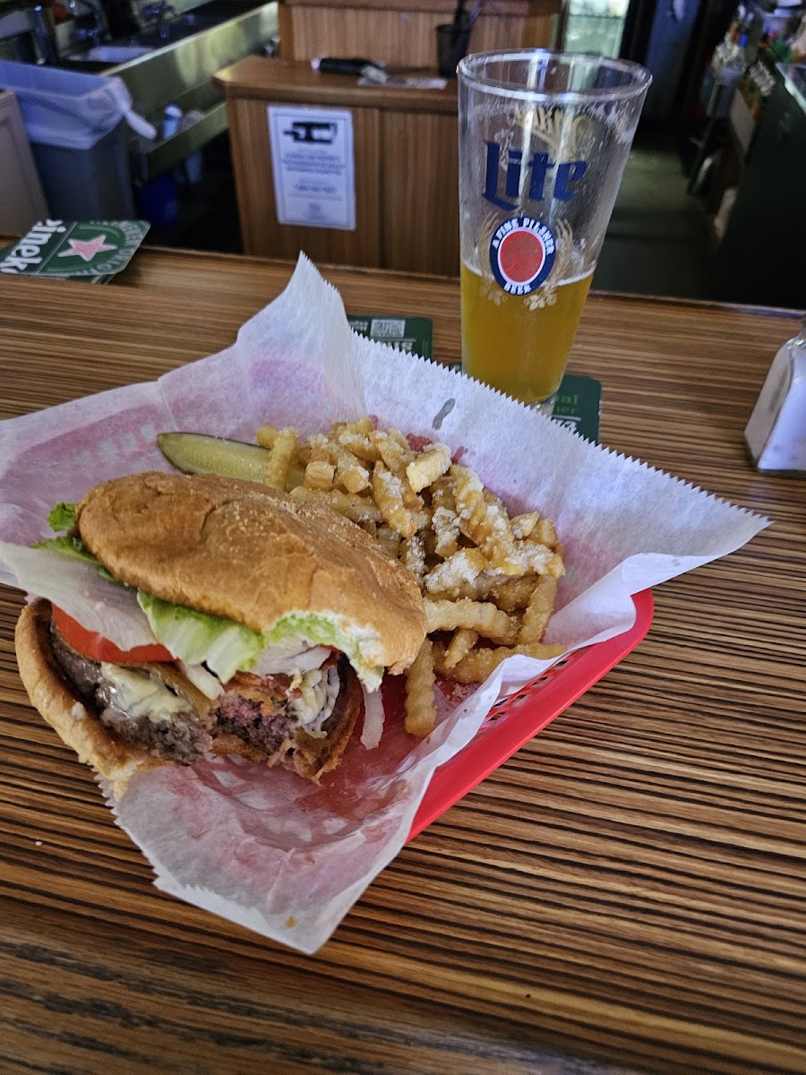 I drive by this place weekly. It cought my eye and I decided to stop in fort lunch. The outside looks like a biker bar, honestly, which adds appeal. Inside is really nice. I say at the bar and pumped a few bucks in the jukebox. Cheryl P gave a detailed answer to my question about the history of the place. She was friendly and provided great service. The burger was huge and cooked as ordered. The beers were $2. This was lunchtime, so maybe happy hour? They have daily drink and food specials.